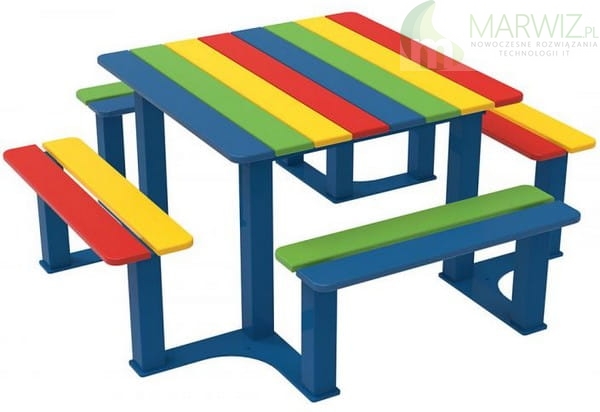 Dwie wersje: przedszkolna lub szkolna. Wymiary stołu: 950 x 950 mm. Wymiary całkowite – wersja przedszkolna: 1500 x 1500 mm. Wymiary całkowite – wersja szkolna: 1630 x 1630 mm. Stelaż: ze stali malowanej na powierzchni cynku, RAL 5010. Siedzisko i stół: listwy z drewna egzotycznego o grubości 22 mm, malowane na różne kolory (RAL czerwony 3020, żółty 1023, zielony 6018, niebieski 5010). Sposób montażu: na płytach. |